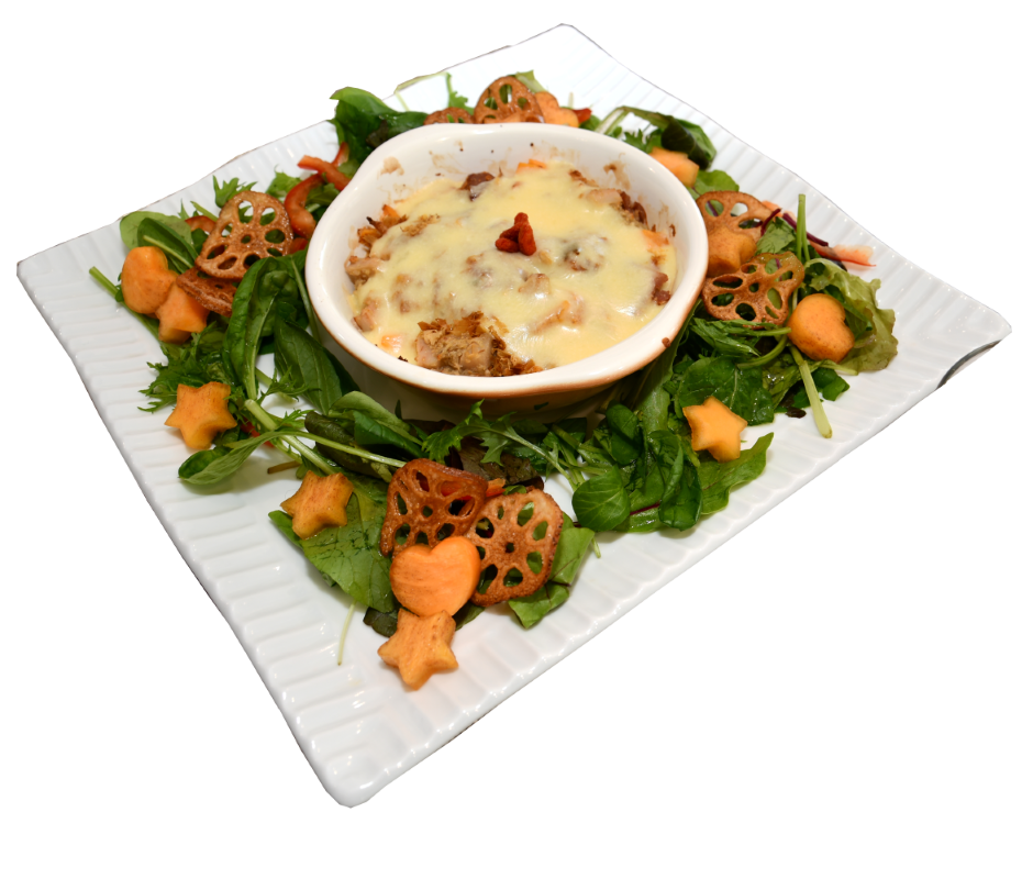 オーブンから取り出したフォンデュ具にかつお節、フォンデュソースをかける。色どりにクコの実をのせる。野菜と盛り付け完成。